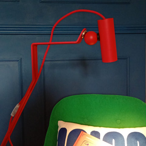 Lampada da poltrona inclinabile. La vittoria della meccanica e dell’analogico sulla domotica. E’ composta da due parti: la base triangolare e l’asta. Con l’aiuto del piede si inclina, con un dito si alza, per regolarla in base alle esigenze del momento.